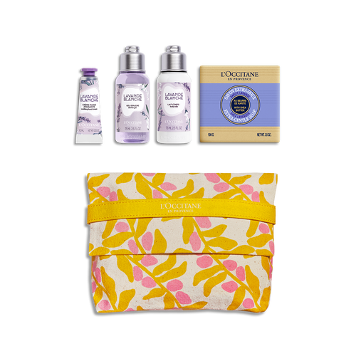 Brenda kësaj cante të bukur krijuar me pambuk të ricikluar, gjeni 4 produktet e preferuara nga lavanda jonë e cmuar: Sapun delikat nga shea-lavanda 25gr, Xhel Dushi Larës nga Lavanda e Bardhë 50ml, Qumësht Trupi Zbukurues nga Lavanda e Bardhë 50ml dhe një Krem Duarsh nga Lavanda e Bardhë 10ml.