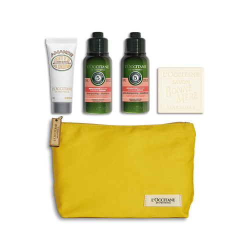 Brenda kësaj cante të bukur krijuar me pambuk të ricikluar, gjeni 4 produktet thelbësore për udhëimet tuaja: një Shampo Riparuese 75ml, një Balsam Riparues 75ml, një Krem Qumësht Bajame 20ml dhe një Sapun Delikat Bonne Mere 25gr.
