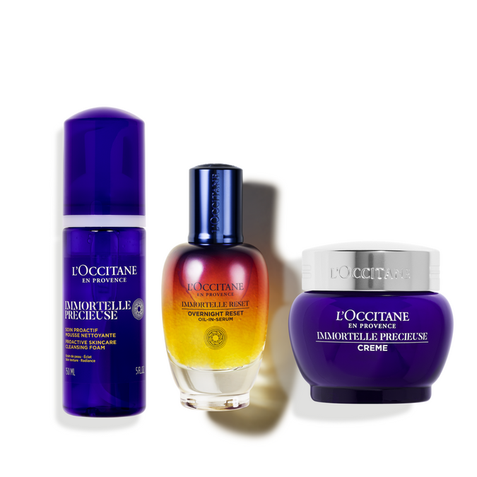 I fuqizuar nga vaji esencial i Bimës Immortelle, lules që nuk vyshket kurrë, ky koleksion nxitës i kolagjenit punon për të rigjeneruar dhe rinovuar lëkurën për një pamje dukshëm më të lëmuar dhe më të re.